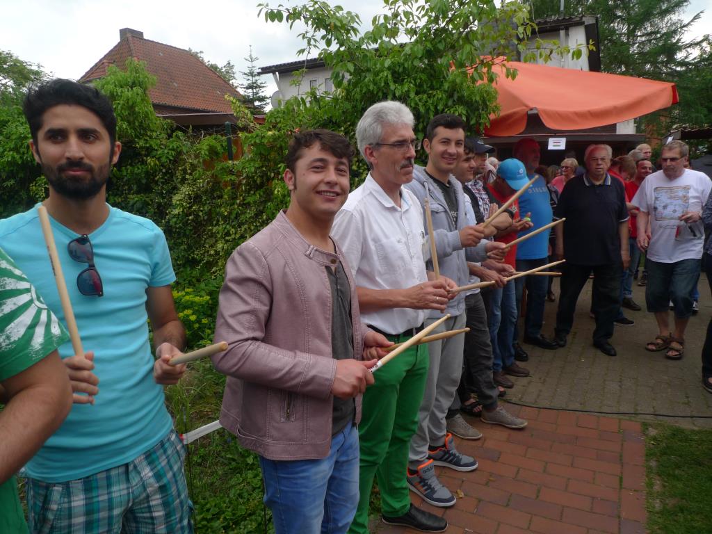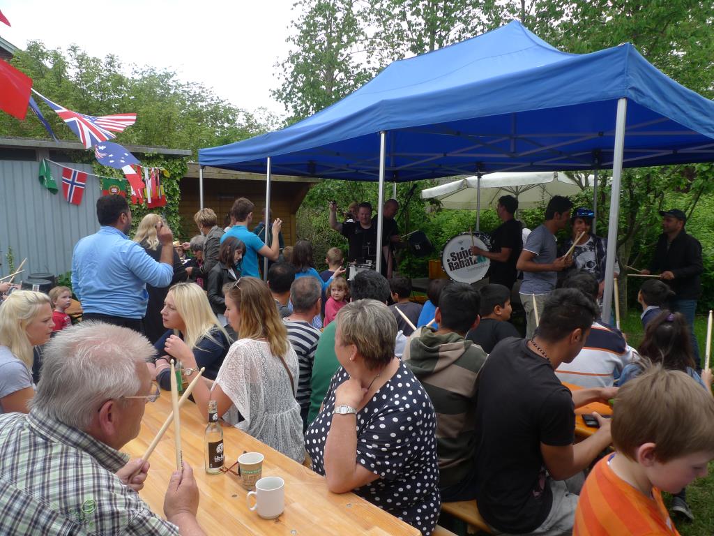 Im Garten der Seemannsmission wurde nicht nur gegessen, sondern auch musiziert. Besonders laut wurde es bei einem gemeinsamen Trommelkurs. Mit Sticks und Rasseln wurde ein heiteres Remmidemmi veranstaltet, das aufzeigte, wie Brunsbüttel bei einem gemeinsamen Rhythmus in Vielfalt geeint sein kann.